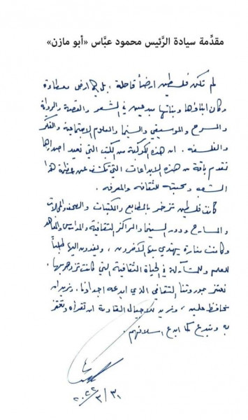 الثقافي كجزء أساس من تعزيز روايتنا الوطنية وحماية وجودنا من خلال التأكيد على ما كانت عليه بلادنا فلسطين كمنارة حضارة وعطاء.