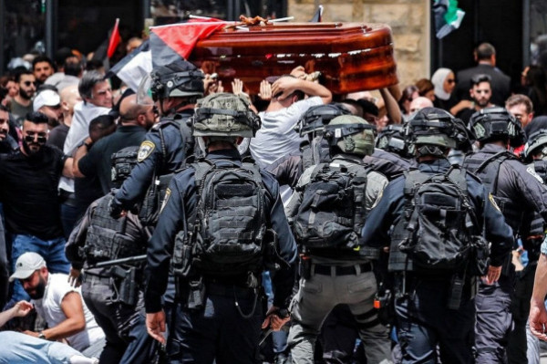 شاهد: مقطع جديد يُعرض للمرة الأولى من اعتداء قوات الاحتلال على جنازة "أبو عاقلة"