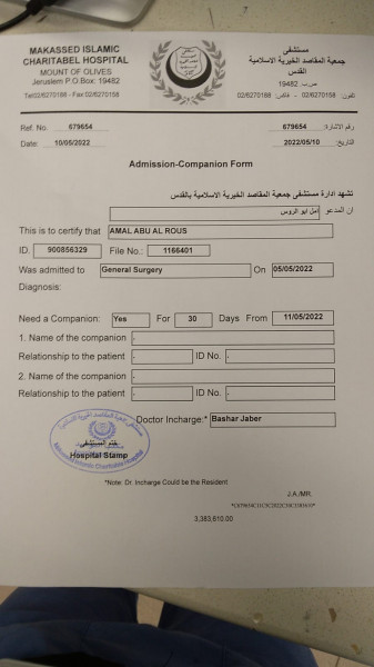 وقالت المواطنة أبو الروس والتي تعيل ثلاثة أطفال: "أن الجانب الإسرائيلي لم يسمح لأي أحد من أقاربها بمرافقتها وفي كل مرة كان يرفض وآخرها سمحوا لي فقط بالمغادرة لوحدي ومضى لي تسعة أيام وانا في مستشفى المقاصد بدون مرافق وقد اجري