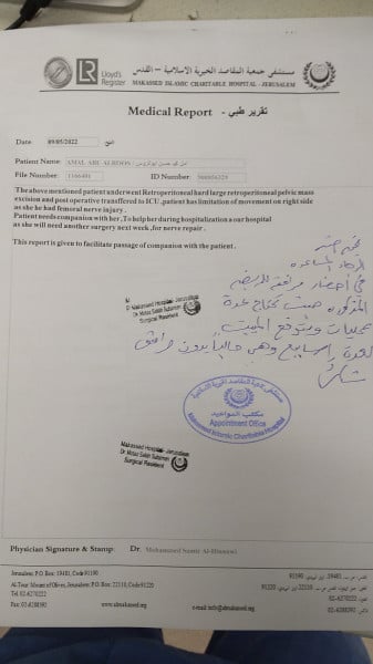 وأشارت المريضة أبو الروس إلى أن أهلها تقدموا مرة أخرى بطلب للسماح لأحد منهم بالسفر ولكن حتى الآن رهن الانتظار بالرغم أن المستشفى زودوني بتقرير بضرورة حضور مرافق معي.