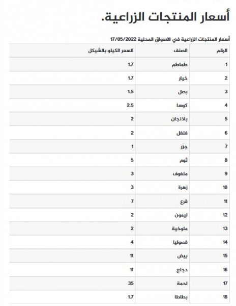 جاءت أسعار الخضروات والفواكه والدجاج واللحوم في قطاع غزة، اليوم الثلاثاء، كما يلي: