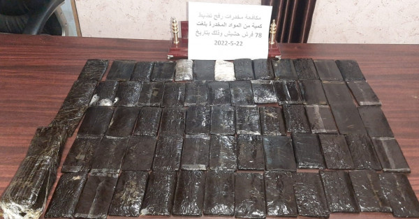 ضبطت شرطة مكافحة المخدرات بمحافظة رفح جنوب قطاع غزة، 78 فرش حشيش خلال مهمة تفتيشية بالمحافظة.