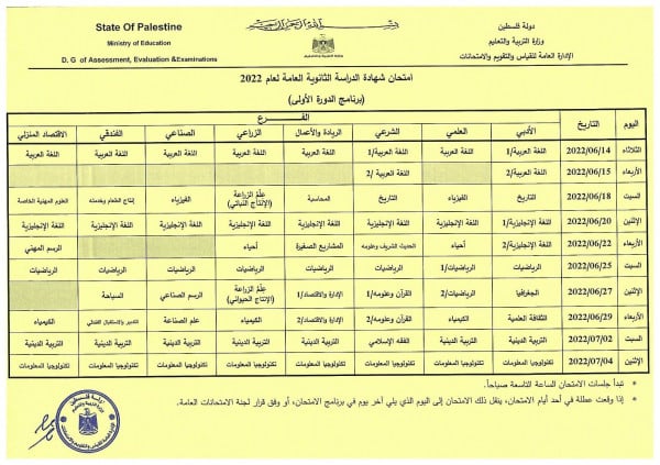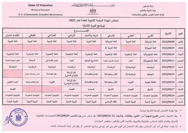 نشرت وزارة التربية والتعليم، اليوم الإثنين، جدول اختبارات الثانوية العامة لعام 2022، وذلك بعد الإعلان عن تأجيلها لمدة أسبوع.