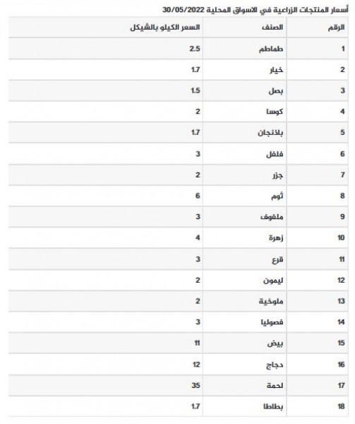 جاءت أسعار الخضروات والفواكه والدجاج واللحوم في قطاع غزة، اليوم الاثنين، كما يلي: