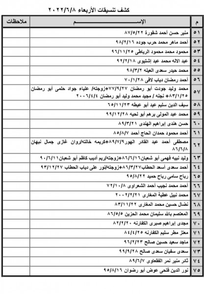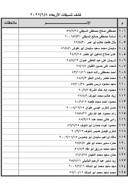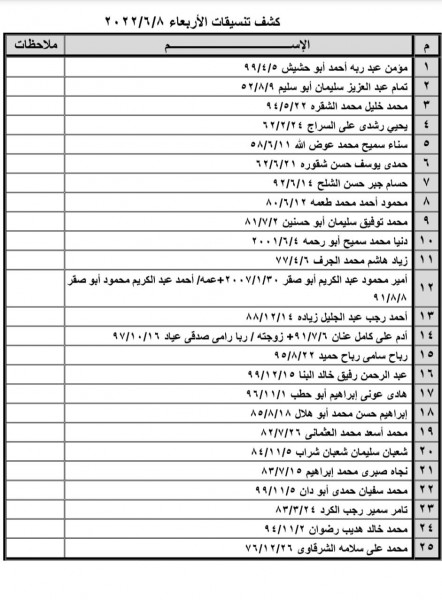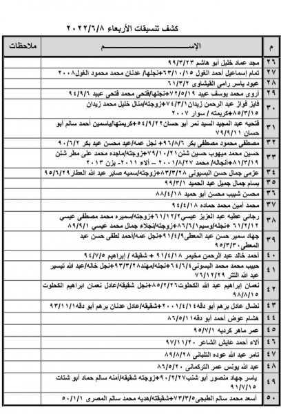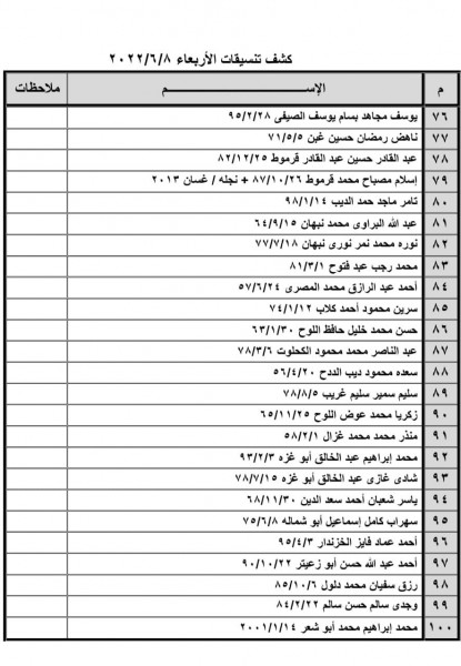 وأضافت: "على الأسماء المذكورة التوجه لإجراء فحص كورونا بدءاً من الساعة التاسعة صباح غد الثلاثاء في المراكز الصحية المعلن عنها مسبقاً بجميع المحافظات".