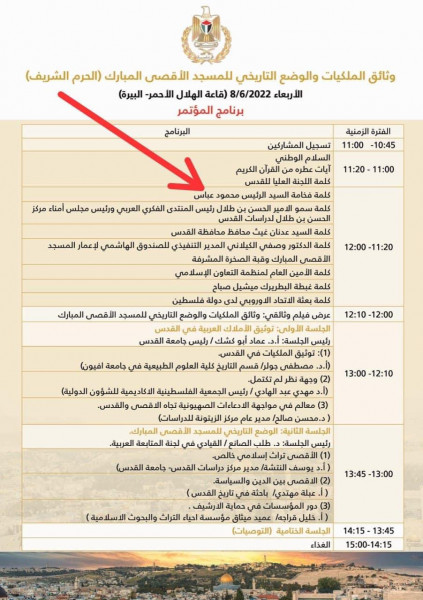 قال مسؤول الإعلام في مفوضية التعبئة والتنظيم، منير الجاغوب، إن الرئيس محمود عباس، يلقي كلمة اليوم الأربعاء في مؤتمر "وثائق الملكيات والوضع التاريخي في الأقصى والقدس" في مقر الهلال الأحمر برام الله بحضور شخصيات عربية ودولية.