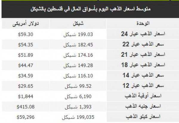 سُجلت أسعار الذهب في أسواق فلسطين، اليوم الجمعة، وفقًا للشيكل الإسرائيلي والدولار، على النحو التالي: