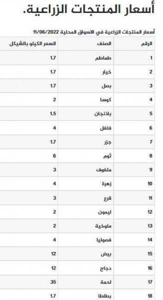جاءت أسعار الخضروات والدجاج واللحوم في أسواق قطاع غزة، اليوم السبت، على النحو التالي: