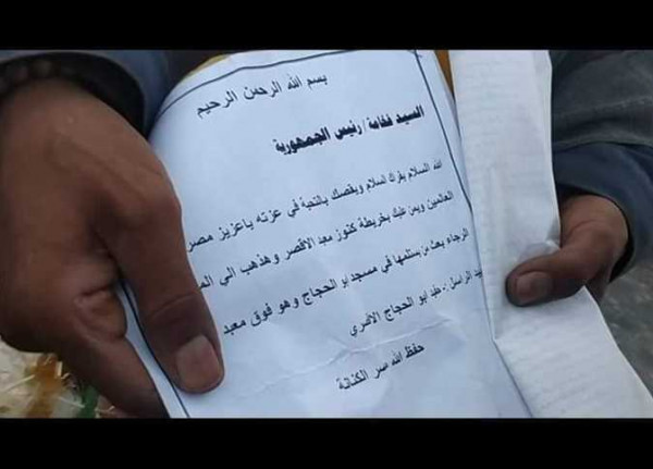 وقالا إنهما يحملان رسالة علم عمرها 12 عاما، وحاولنا التواصل مع رئيس الجمهورية ورئيس الوزراء والمحافظ لتوصيل الرسالة وتسليم الكنز الذي أرسله إليهم سيدي أبو الحجاج الأقصري، وهو كنز كبير جدا، وسيغني أهل المحافظة كلها على حسب قولهما".