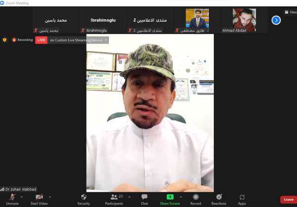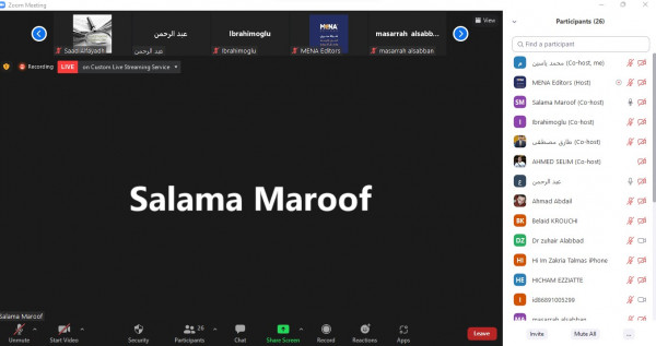 جاء ذلك خلال ندوة إعلامية إلكترونية بعنوان "سبل تعزيز الرواية الفلسطينية في الإعلام العربي" نظمها منتدى الإعلاميين الفلسطينيين بالتعاون مع شبكة محرري الشرق الأوسط وشمال أفريقيا، بمشاركة رئيس الشبكة إبراهيم أوغلو ونقيب الصحفيين الكويتيين د. زهير العباد ورئيس المكتب الإعلامي الحكومي الفلسطيني سلامة معروف ومدير منتدى الإعلاميين الفلسطينيين محمد ياسين ونخبة من الإعلاميين والمهتمين بالقضية الفلسطينية من أقطار مختلفة، وأدار الندوة الإعلامي الفلسطيني المقيم في تركيا طارق مصطفى.