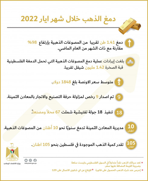 وسجل متوسط سعر أونصة الذهب عن شهر ايار 2022 مبلغ (1848) دولار، مسجلة تساوي مع ذات الشهر من العام 2021.