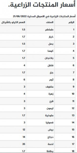 جاءت أسعار الخضروات واللحوم في أسواق قطاع غزة، اليوم الثلاثاء، على النحو التالي: