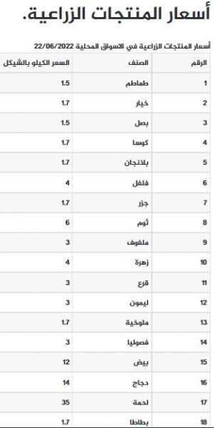 جاءت أسعار الخضروات والدجاج واللحوم في قطاع غزة، اليوم الأربعاء، كما يلي: