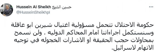 واكد الشيخ في تغريدة نشرها، مساء اليوم الاثنين، على صفحته في موقع (فيسبوك)، أن حكومة الاحتلال الإسرائيلي تتحمل مسؤولية اغتيال شيرين أبو عاقلة.