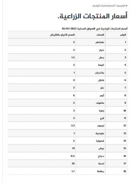 جاءت أسعار الخضروات والفواكه والدجاج واللحوم في أسواق قطاع غزة، اليوم الثلاثاء، كما يلي: