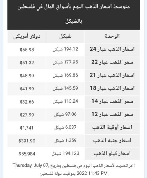 جاءت أسعار الذهب في الأسواق الفلسطينية اليوم الجمعة 8 تموز/ يوليو 2022 كما يلي: