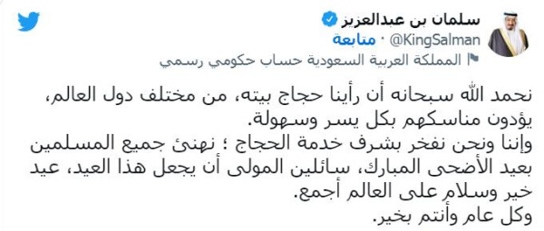 وعلى حسابه في "تويتر"، كتب الملك سلمان بن عبد العزيز: "نحمد الله سبحانه أن رأينا حجاج بيته، من مختلف دول العالم، يؤدون مناسكهم بكل يسر وسهولة..وإننا ونحن نفخر بشرف خدمة الحجاج، نهنئ جميع المسلمين بعيد الأضحى المبارك، سائلين المولى أن يجعل هذا العيد، عيد خير وسلام على العالم أجمع..وكل عام وأنتم بخير".