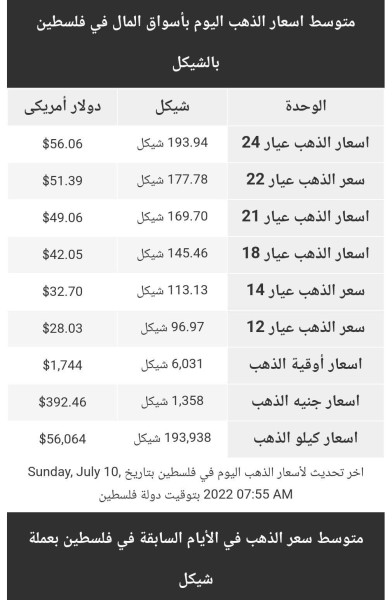 سُجلت أسعار الذهب في أسواق فلسطين، اليوم الأحد، فقًا للشيكل الإسرائيلي والدولار، على النحو التالي: