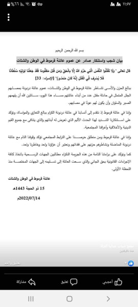 وأعلنت خلال البيان، عن "براءتها الكاملة من الفعل الإجرامي والذي يتحمل وزره الجاني نفسه، مؤكدة على مطالبتها الجهات الحكومية المختصة باتخاذ كافة الإجراءت القانونية بحقه".