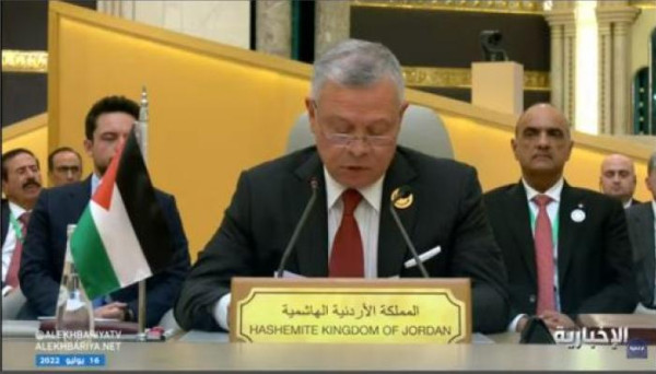 وقال الملك عبد الثاني خلال كلمة له في القمة العربية الامريكية في جدة، إنه "لا أمن ولا استقرار في المنطقة دون حل للقضية الفلسطينية وإقامة دولة على حدود 67".