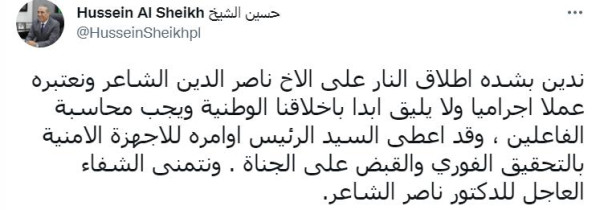عقب حسين الشيخ، أمين سر اللجنة التنفيذية لمنظمة التحرير الفلسطينية، على حادثة إطلاق النار على ناصر الشاعر، القيادي في حركة المقاومة الاسلامية (حماس)، برصاص مجهولين في مدينة نابلس.