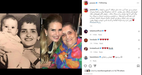 نشرت الفنانة المصرية، يسرا، صورة تجمعها بوالدتها الراحلة، مستذكرة إياها بكلمات مؤثرة بمناسبة حلول الذكرى السنوية الثالثة لرحيلها، حيث عبرت عن شوقها لها وحزنها بوفاتها، قائلة: "حبيبتي و نور عنيا أمي، عدى على فراقك ٣ سنين والوقت والوجع على فراقك مش بيعدي، أنا كنت محظوظة بيكي وبنعمة وجودك وكل اللي أنا فيه بفضل ربنا وببركة دعائك، مفيش كلام هيوفيكي حقك كنتِ نعمَ الأم والصديقة، وحشتيني ووحشني حضنك وصوتك، ربنا يصبرني على فراقك، ويقدرني أفضل مكملة بسيرتك الحلوة".