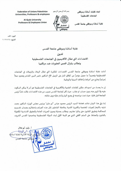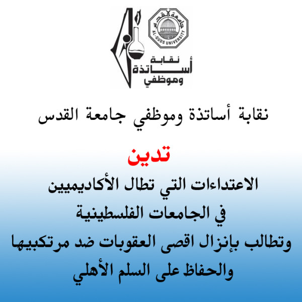 أدانت نقابة اساتذة وموظفي جامعة القدس الاعتداءات المتكررة التي تطال الزملاء والزميلات في الجامعات الفلسطينية وتحديداً ما حصل مؤخراً من أطلاق النار على الزميل الأخ الدكتور ناصر الدين الشاعر ونعتبره عملاً إجرامياً وخارج عن أعرافنا وأخلاقنا الدينية والوطنية.