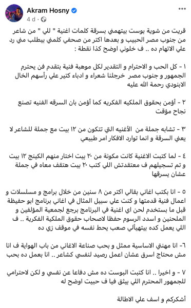 واختتم حديثه بقوله "أنا مهنتي الأساسية ممثل وبحب صناعة الأغاني من باب الهواية فأنا مش محتاج أسرق عشان أعمل رصيد لنفسي كشاعر أنا بعمل ده بحب..وأخيرًا أنا كتبت البوست ده مش دفاعًا عن نفسي ولكن لاحترامي للجمهور المحترم اللي بيثق فيا فحبيت أوضح له".