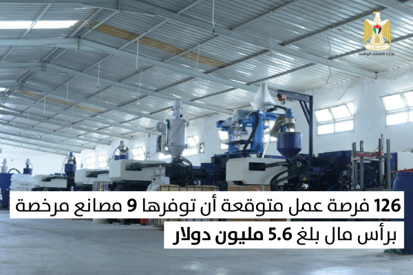 وتوقعت وزارة الاقتصاد في بيان لها، أن المصانع ستوفر لدى المباشرة في إقامتها في محافظات الخلیل وبیت لحم وجنین وقلقیلیة ونابلس، أكثر من 126 فرصة عمل.