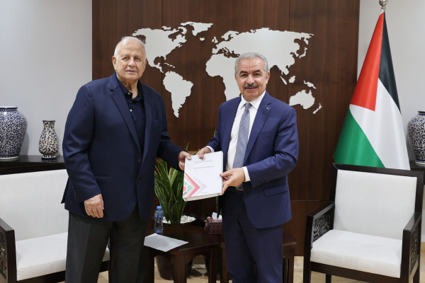 تسلم رئيس الوزراء د. محمد اشتية تقرير لجنة الانتخابات المحلية للعام 2021، من رئيس لجنة الانتخابات المركزية د. حنا ناصر، اليوم الثلاثاء في مكتبه برام الله.