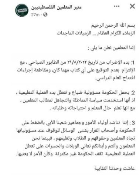 وقال منبر المعلمين، خلال منشور عبر صفحته على (فيسبوك)، إننا "نعلن بدء الإضراب من تاريخ 2022/8/29 من الطابور الصباحي ، مع الإلتزام بعدم التوقيع على أي كتاب مهما كان، ومقاطعة إجراءات افتتاح العام الدراسي".