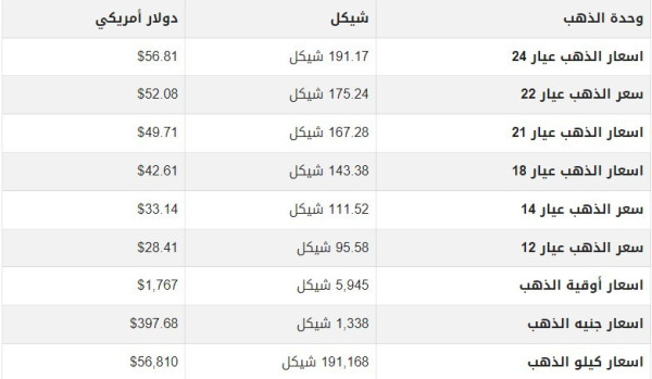 جاءت أسعار الذهب بجميع عياراته (عيار 24, 22, 18, 14, 12) في فلسطين، اليوم الخميس مقابل العملة المحلية الشيكل والدولار الأمريكي وفقاً لأسواق المال الفلسطينية، كالتالي :-