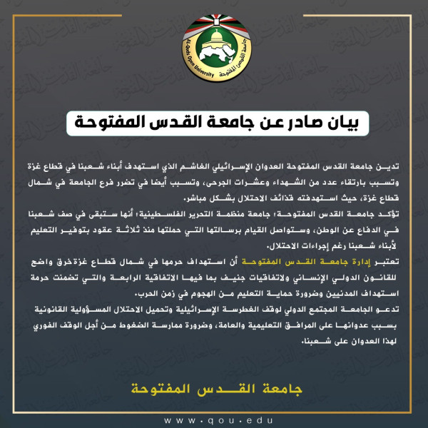 و اعتبرت إدارة جامعة القدس المفتوحة أن استهداف حرمها في شمال قطاع غزة خرق واضح للقانون الدولي الإنساني ولاتفاقيات جنيف بما فيها الاتفاقية الرابعة التي تضمنت حرمة استهداف المدنيين وضرورة حماية التعليم من الهجوم في زمن الحرب.