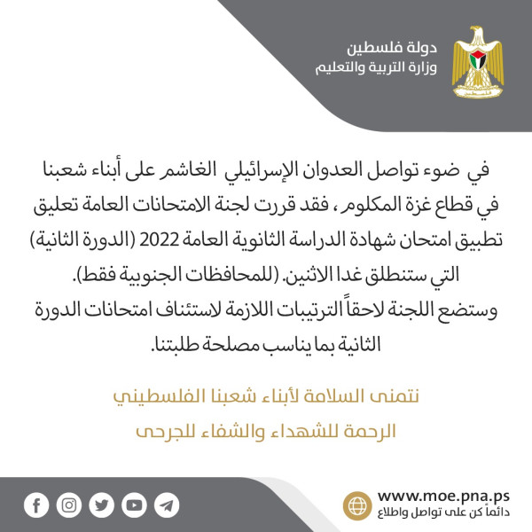 وقالت الوزارة في تصريح مقتضب إن لجنة الامتحانات قررت في ضوء تواصل العدوان الإسرائيلي، تعليق تطبيق امتحان شهادة الثانوية العامة 2022 التي ستنطلق غداً الاثنين، (للمحافظات الجنوبية) فقط.