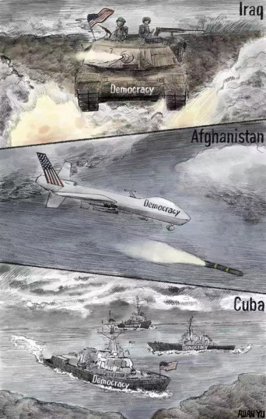 ونشر المتحدث صورة تصور ثلاث صراعات استخدمت فيها الولايات المتحدة القوة تحت شعار نشر الديمقراطية: العراق وأفغانستان وكوبا.