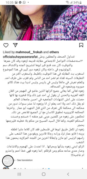 أعربت سها عرفات زوجة الرئيس الفلسطيني الراحل، ياسر عرفات، عن استغرابها من قيام نشطاء وبعض مواقع التواصل الاجتماعي، من إعادة بث ونشر لمقابلة "قديمة" أجرتها إحدى وسائل الإعلام العربية مع ابنتها زهوة عرفات، انتقدوا من خلالها عدم إتقانها للغة العربية.