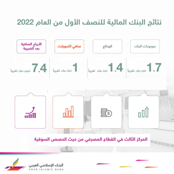 البنك الإسلامي العربي يحقق أرباحاً صافية تجاوزت 7.4 مليون دولار