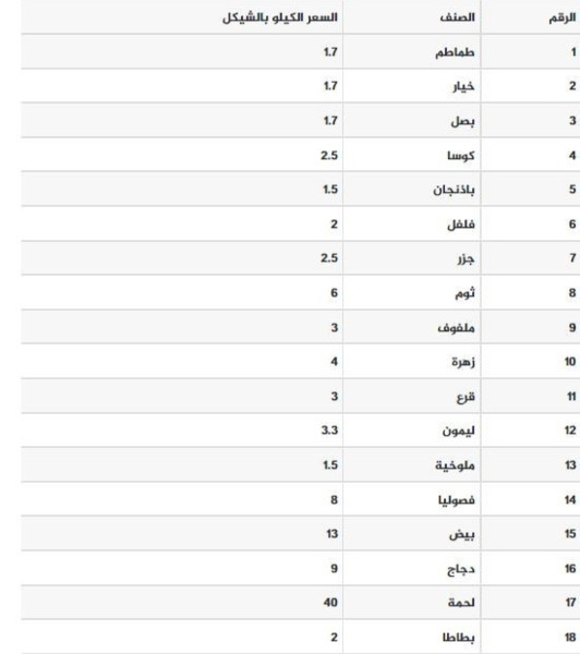 جاءت أسعار الخضروات واللحوم في أسواق غزة، اليوم الأحد، على النحو التالي: