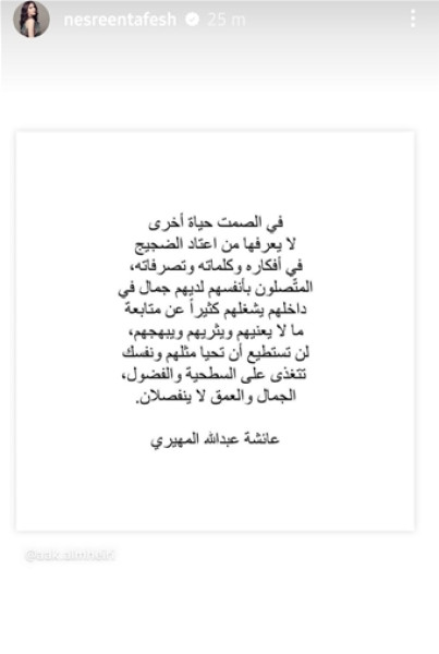 و نشرت طافش عبر حسابها الخاص في تطبيق تبادل الصور في خاصية (ستوري) مقولة استعانت بها من الكاتبة عائشة عبد الله المهيري وكتبت " في الصمت حياة أخرى لا يعرفها من اعتاد الضجيج في أفكاره وكلماته وتصرفاته، المتصلون بأنفسهم لديهم جمال في داخلهم، يشغلون كثيرًا عن متابعة ما لا يعنيهم ويثريهم ويبهجهم، لن تستطيع أن تحيا مثلهم ونفسك تتغدى على السطحية والفضول الجمال والعمق لا ينفصلان"، وفق (في الفن).