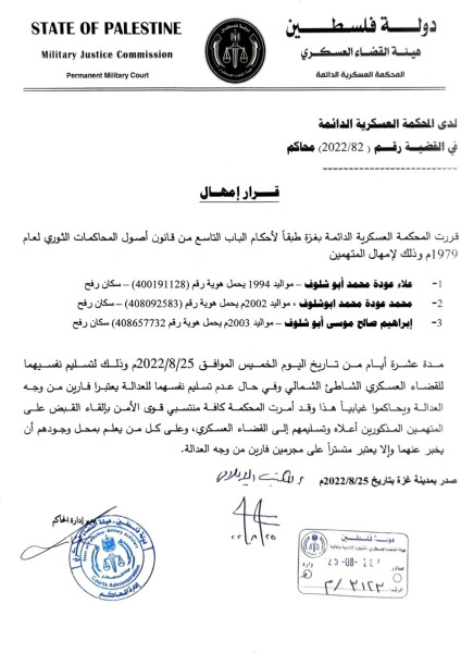 أمهلت المحكمة العسكرية الدائمة- التابعة لهيئة القضاء العسكري في غزة، المتهم علاء عودة محمد أبو شلوف، هوية رقم (400191128)، سكان رفح، والمتهم محمد عودة محمد أبو شلوف، هوية رقم (408092583)، سكان رفح، والمتهم إبراهيم صالح موسى أبو شلوف، هوية رقم (408627732)، سكان رفح، عشرة أيام من تاريخ اليوم الخميس الموافق 25/08/2022م، لتسليم أنفسهم للقضاء العسكري.
