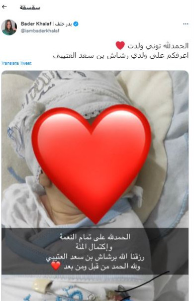 و قبل يومين قام بدر خلف بنشر صورة لطفل صغير ولكن قام بتغطية ملامحه، وعلق عليها قائلًا: "الحمدلله توني ولدت اعرفكم على ولدي رشاش بن سعد العتيبي".