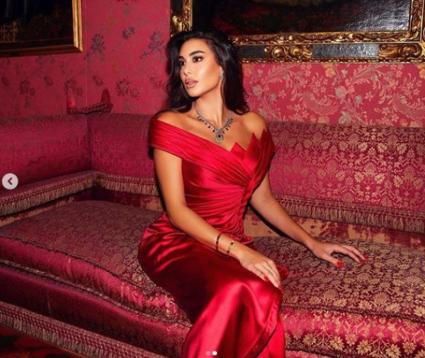 و ظهرت الفنانة المصرية بفستان ستان أحمر حيث اعتمدت في إطلالتها على تسريحة الشعر الويفي المنسدل على كتفيها، بالإضافة لإكسسواراتها التي ارتدتها، وهي المجوهرات التي زادت من جمال إطلالتها، حيث إرتدت عقد بحبات طولية باللون الأحمر، وحلق صغير وأنيق، بالإضافة لإرتدائها لإسوارتها المفضلة.