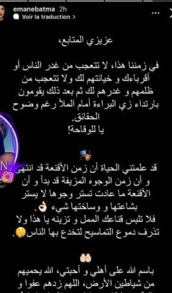 و كتبت على خاصية (ستوري): "عزيز المتابع، في زمننا هذا لا تتعجب من غدر الناس أو أقربائك وخيانتهم لك، ولا تتعجب من ظلمهم وغدرهم لك، ثم بعد ذلك يرتدون زي البراءة أمام الملأ رغم وضوح الحقائق. يا للوقاحة".
