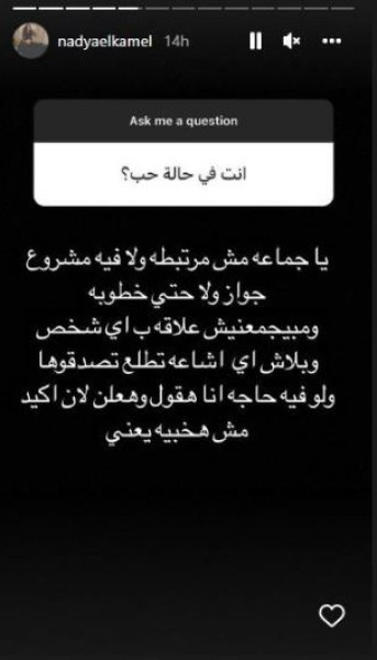 و ردت الكامل على سؤال في حسابها الخاص عبر تطبيق تبادل الصور (إنستغرام) خلال حوار مفتوح مع جمهورها ليسألها أحدهم هل أنت في حالة حب، لتفاجؤه وترد عليه: "ياجماعة مش مرتبطة ولا فيه مشروع جواز ولا حتى خطوبة، ومبيجمعنيش علاقة بأي شخص وبلاش أي إشاعة تطلع تصدقوها ولو فيه حاجة أنا هقول وهعلن لأني أكيد مش هخبيه يعني".