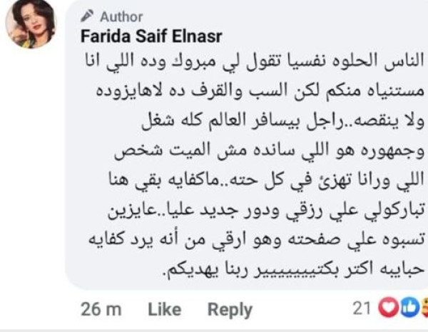 و لم تصمت الفنانة للانتقادات التي طالتها، حيث ردت عليها قائلة: "الناس الحلوة نفسيا تقول لي مبروك، وده اللي أنا مستنياه منكم لكن السب والقرف ده لا هايزوده ولا ينقصه، راجل بيسافر العالم كله شغل وجمهوره هو اللي سانده، مش الميت شخص اللي ورانا تهزئ في كل حته، ماكفاية بقي هنا تباركولي علي رزقي ودور جديد عليا، عايزين تسبوه، علي صفحته، وهو أرقي من أنه يرد، كفايه حبايبه أكتر بكتير، ربنا يهديكم".