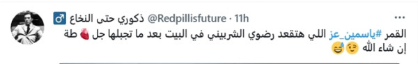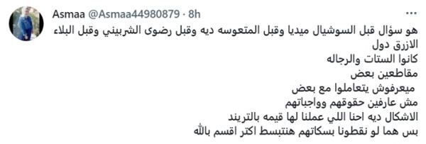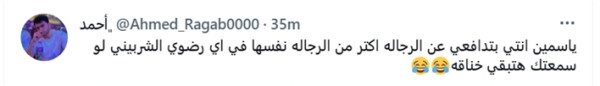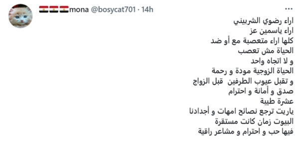 وتساءلت تغريدة أخرى عن الجدوى من هذه التصريحات قائلة : "هو قبل السوشيال ميديا الستات والرجالة كانوا مقاطعين بعض؟"، حيث طالبت تغريدة أخرى بعقد مناظرة بين رضوى الشربيني وياسمين عز، بشرط أن تكون مصورة، ووصلت التعليقات لدرجة أن أحد المغردين كتب: "لو لقيت واحدة مش عاجبها آراء رضوى الشربيني وياسمين عز هتجوزها حالا".