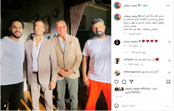 وعلّق رمضان على الصورة قائلًا: "بسم الله بدأنا أول أيام تصوير مسلسل "العمدة"، إنتاج السعدي وجوهر، تأليف مهاب طارق، إخراج محمد سامي، رمضان يجمعنا، ثقة في الله نجاح".