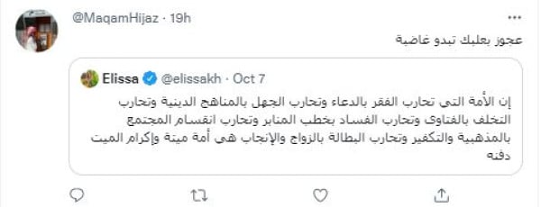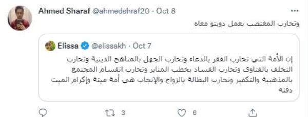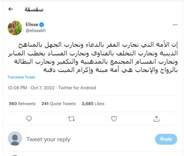 و غردت إليسا عبر حسابه الخاص في تطبيق (تويتر): "إن الأمة التي تحارب الفقر بالدعاء وتحارب الجهل بالمناهج الدينية وتحارب التخلف بالفتاوى وتحارب الفساد بخطب المنابر وتحارب انقسام المجتمع بالمذهبية والتكفير وتحارب البطالة بالزواج والإنجاب هي أمة ميتة وإكرام الميت دفنه".