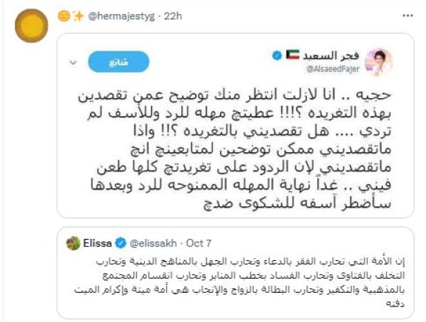 وقامت الإعلامية الكويتية فجر السعيد بالرد على هذه التغريدة، حيث قالت: " حجية.. أنا لازلت أنتظر منك توضيح عمن تقصدين بهذه التغريدة.. أعطيتك مهلة للرد وللأسف لم تردي.. هل تقصديني بالتغريدة؟.. واذا ما تقصديني ممكن توضحين لمتابعينك انك ما تقصديني لأن الردود على تغريدتك كلها طعن فيني.. غدًا نهاية المهلة الممنوحة للرد وبعدها سأضطر آسفة للشكوى ضدك".