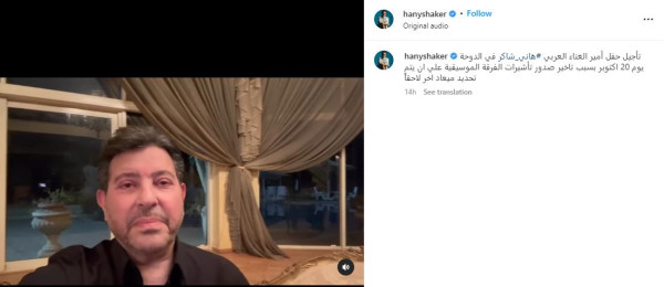 وعلق على الفيديو: "تأجيل حفل أمير الغناء العربي هاني شاكر في الدوحة يوم 20 اكتوبر بسبب تاخير صدور تأشيرات الفرقة الموسيقية علي ان يتم تحديد ميعاد اخر لاحقاً".